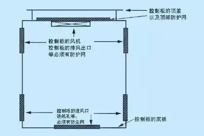(2) 控制柜頂部出風口上面要安裝防護頂蓋,防止雜物直接落入;防護頂蓋高度要合理,不影響排風。防護頂蓋的側面出風口要安裝防護網,防止絮狀雜物直接落入。