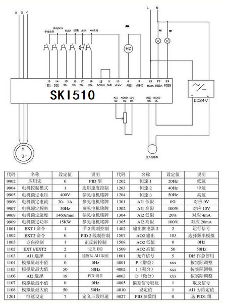 一,設計思路:選用一臺 15KW 具有 PID 功能的變頻器,可以不考慮輸入電抗器,電機速度由設定頻率與泵出口壓力作比較進行 PID 調節(jié),設計應考慮能手 /自動轉換。